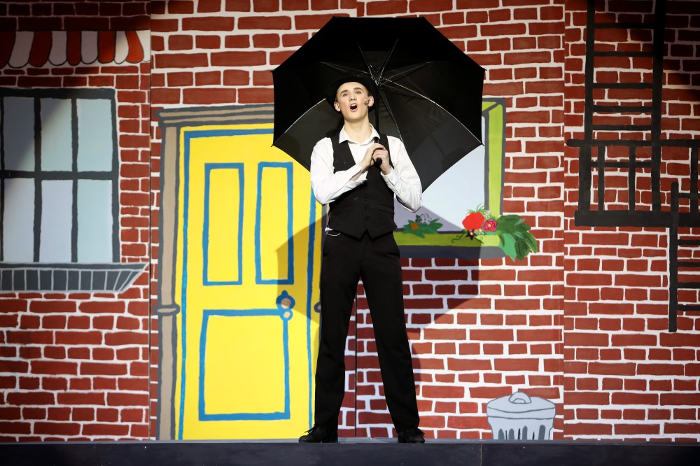 Don Lockwood, played by Aiden Simard, dances in a downpour during the dress rehearsal for Ecole Secondaire Neelin High School's production of Singing in the Rain at the Western Manitoba Centennial Auditorium on Wednesday. (Tim Smith/The Brandon Sun)