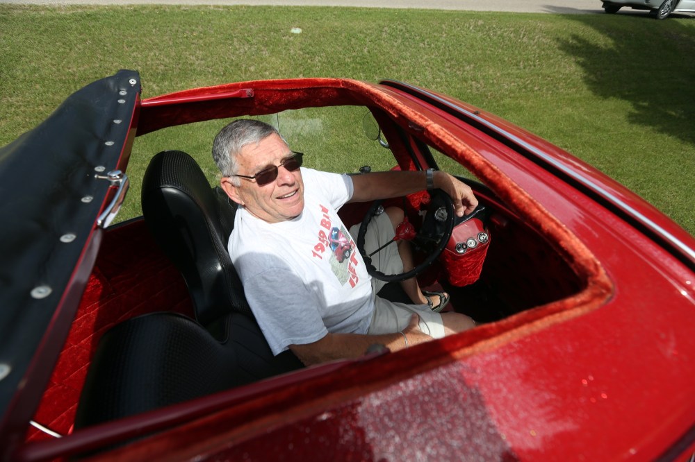 The vehicle is technically street legal, but he doesn’t take it out on highways due to its limited speed, and stays clear of gravel roads due to the costly process it would take to replace its curved glass windshield.