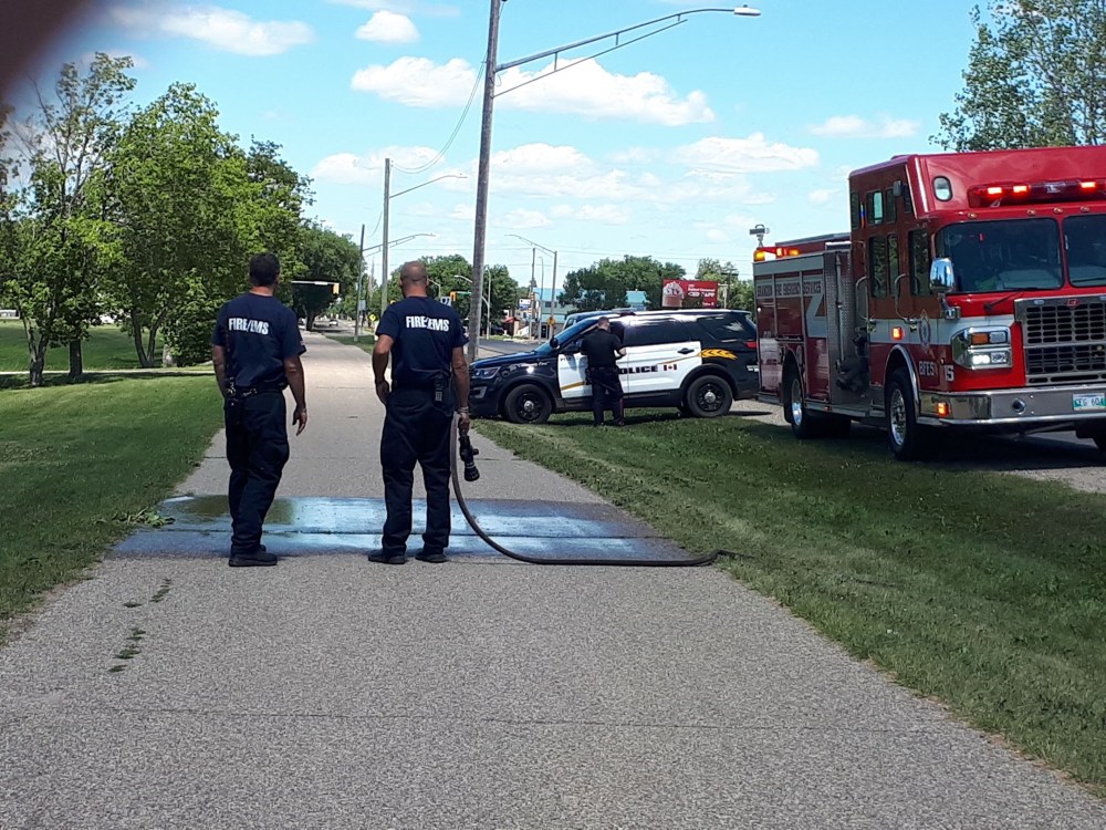 The woman was placed on a stretcher and transported to the Brandon Regional Hospital. Her dog was taken to the Wheat City Veterinary Clinic.