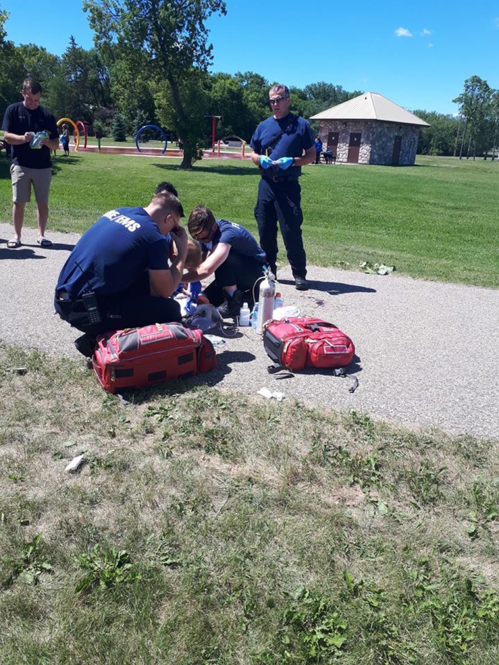 Melissa Verge/The Brandon Sun Emergency personnel administer first aid to a dog after the attack at Kin Park on Sunday.