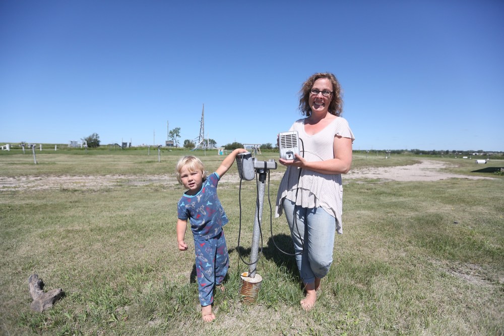 Tyler Clarke/The Brandon Sun Shamrock Drive-In theatre co-owner Joanne Struss, pictured with son Luke, hold up speaker boxes that dot their property just south of Killarney. Pictured in the background is the last remaining pillar of their old drive-in screen, which the Struss family still intends to rebuild.