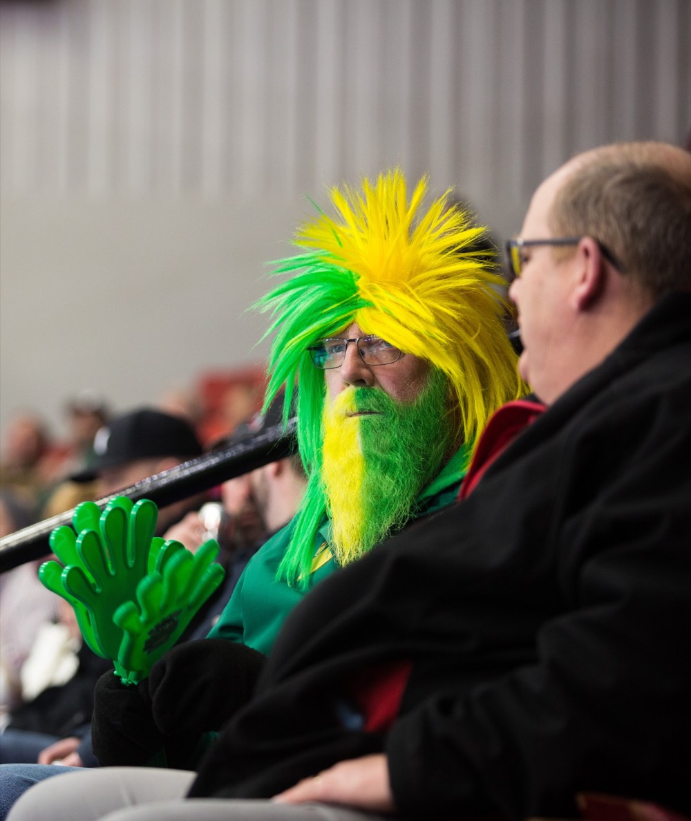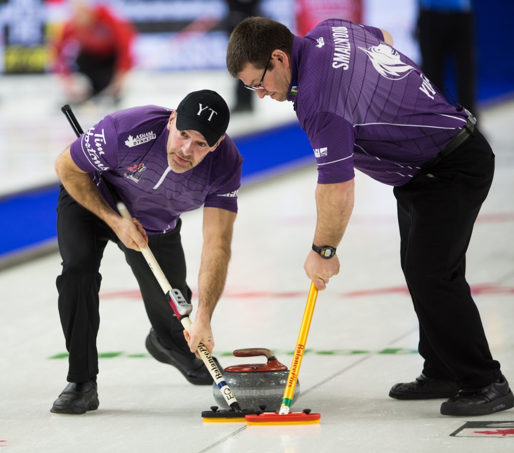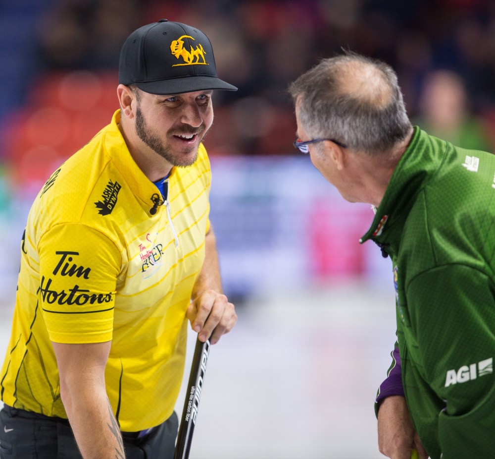 Manitoba Premier Brian Pallister laughs while hearing a story from Manitoba third Reid Carruthers prior to walking the team out for their fourth game at the Tim Hortons Brier at Westoba Place on Monday afternoon.Team Yukon led by Skip Jon Solberg take on Team Quebec Skip Martin Crête in the first official fame of the 2019 Tim Hortons Brier at Westoba Place Saturday. (Chelsea Kemp/The Brandon Sun)Team Quebec Skip Martin Crête watches his team deliver the rock during a game against Team Yukon led by Skip Jon Solberg at the 2019 Tim Hortons Brier at Westoba Place Saturday. (Chelsea Kemp/The Brandon Sun)Team Saskatchewan led by skip Kirk Muyres aims to knock out Team Manitoba led by Skip Mike McEwen take on at the 2019 Tim Hortons Brier at Westoba Place Saturday. (Chelsea Kemp/The Brandon Sun)Team Saskatchewan third Kevin Marsh watches his team deliver the rock during a game against Team Manitoba led by Skip Mike McEwen at the 2019 Tim Hortons Brier at Westoba Place Saturday. (Chelsea Kemp/The Brandon Sun)Maxine and Keith Forbes sit with their pin collection at the 2019 Tim Hortons Brier at Westoba Place Saturday afternoon. (Chelsea Kemp/The Brandon Sun)Team Manitoba Mike McEwan are cheered on by fans as they take on Team Northern Ontario Brad Jacobs at the 2019 Tim Hortons Brier Tuesday evening. (Chelsea Kemp/The Brandon Sun)Hans Madsen, from Yorkton, Sask., cheers on Team Saskatchewan Kirk Muyers as they play Team Newfoundland and Labrador Andrew Symonds at the 2019 Tim Hortons Brier Tuesday evening. (Chelsea Kemp/The Brandon Sun)Fan cheer on Team Manitoba Mike McEwen as they play Team Prince Edward Island John Likely at the 2019 Tim Hortons Brier Wednesday afternoon. (Chelsea Kemp/The Brandon Sun)Team Manitoba Mike McEwen second Derek Samagalski talks with Team Prince Edward Island skip John Likely at the 2019 Tim Hortons Brier Wednesday afternoon. (Chelsea Kemp/The Brandon Sun)Volunteer Greg Rabe, 64, gets ready to help clear the ice between games at the 2019 Tim Hortons Brier Wednesday afternoon. (Chelsea Kemp/The Brandon Sun)Melissa Verge/The Brandon Sun