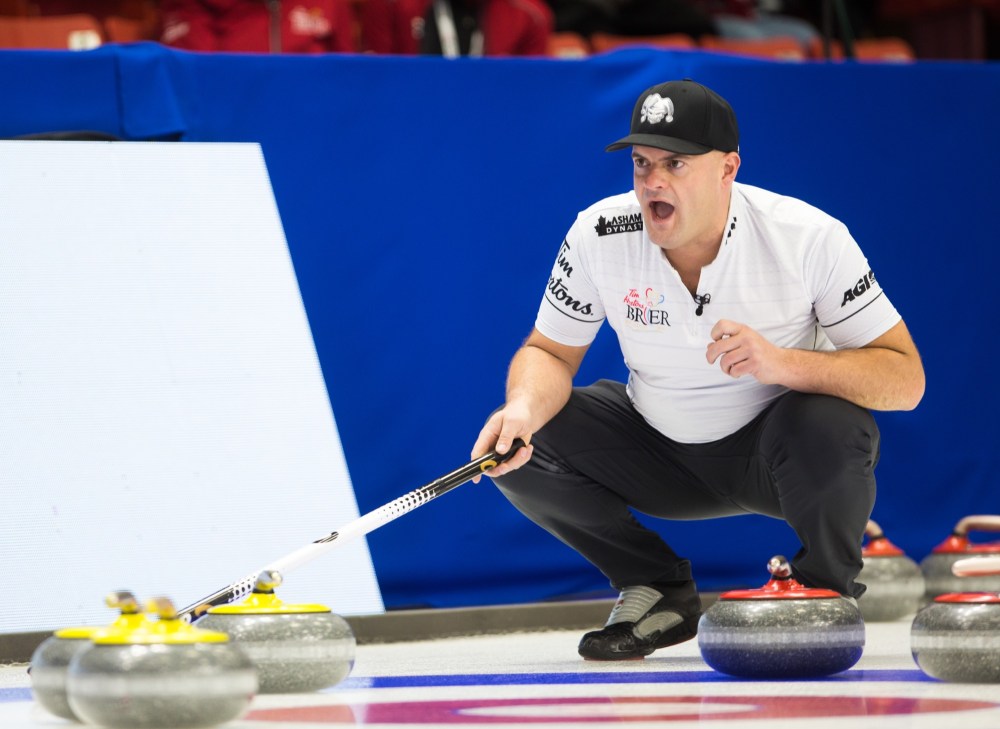 Team Manitoba skip Mike McEwen smiles at a good throw against Team Prince Edward Island John Likely at the 2019 Tim Hortons Brier Wednesday afternoon.Chelsea Kemp/The Brandon Sun