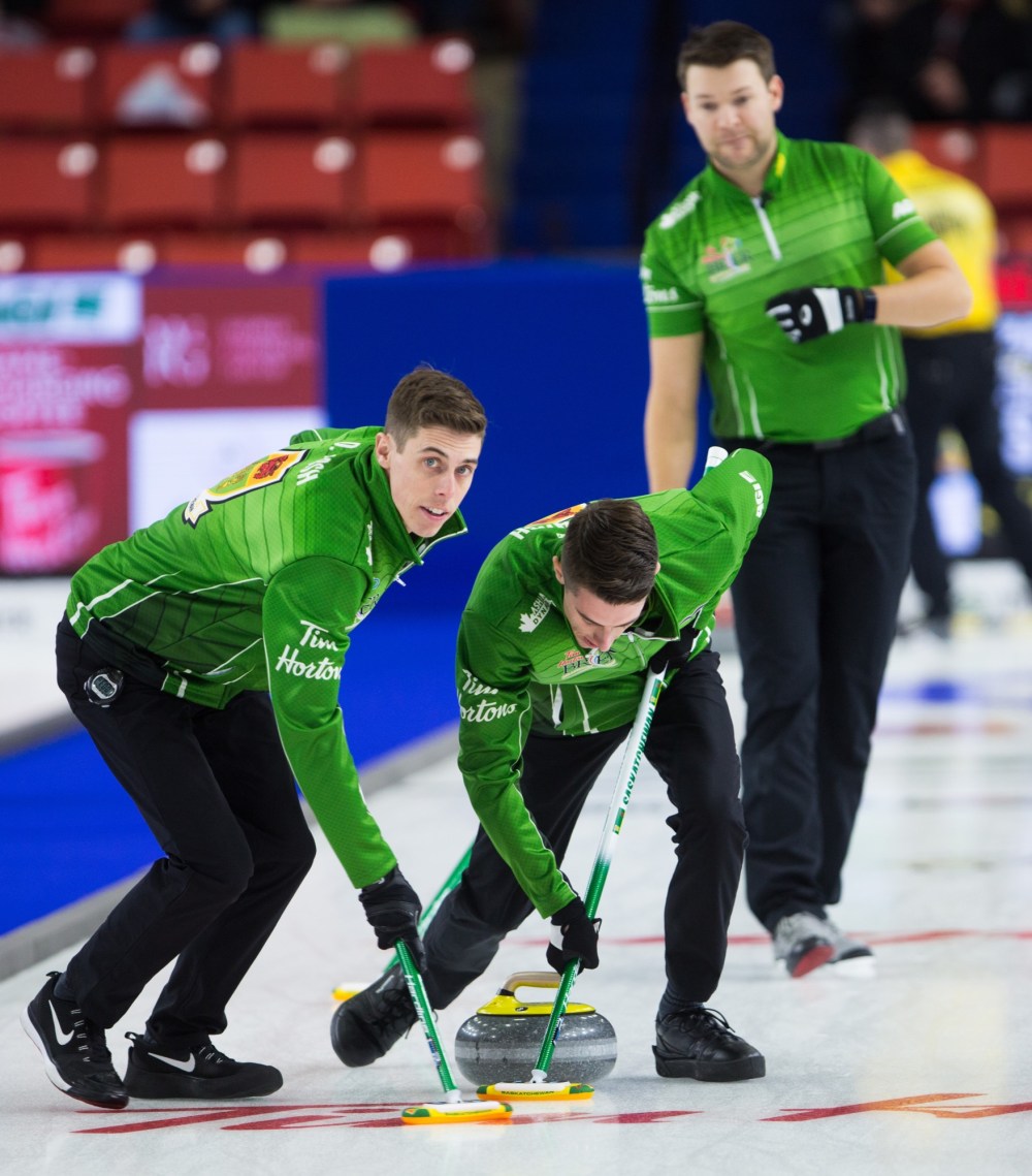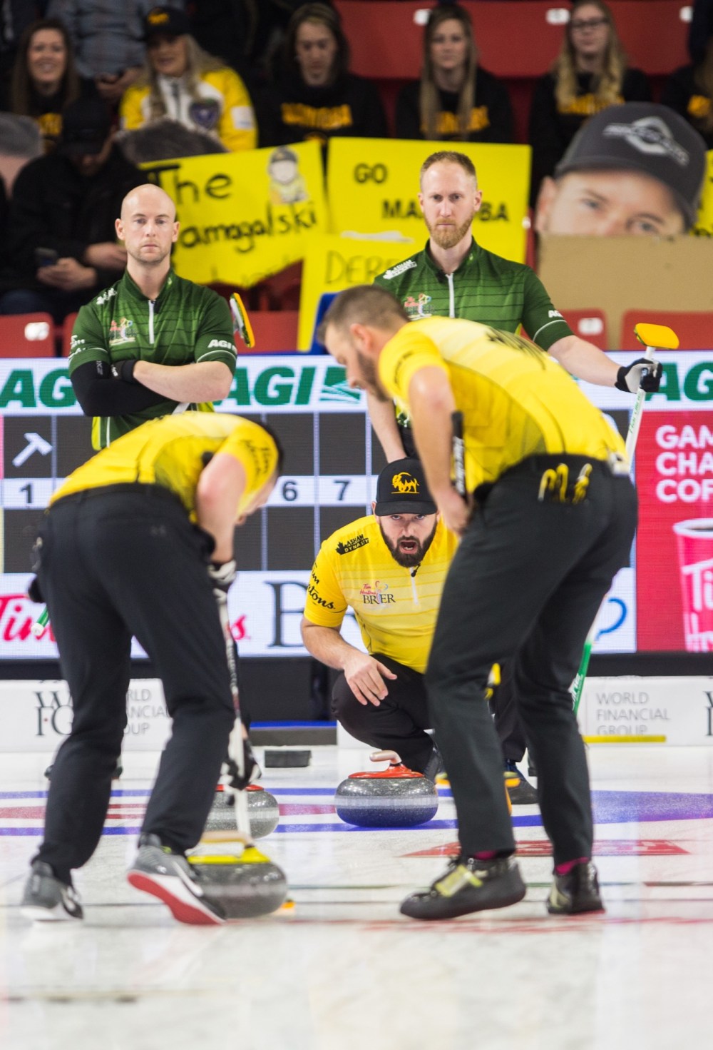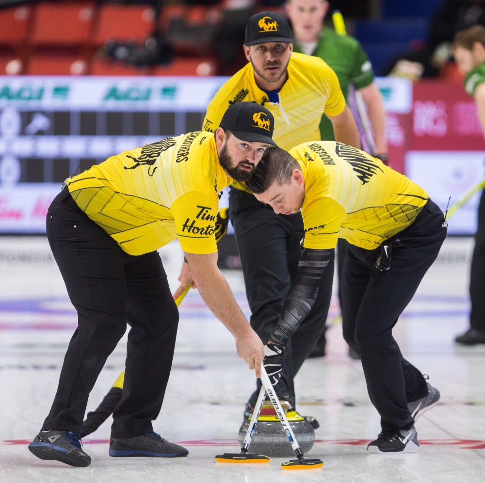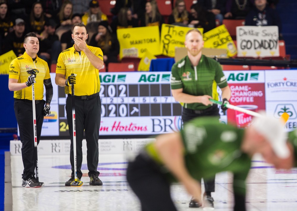 Team Manitoba skip Mike McEwan, left, and second Derek Samagalski watch a throw from Team Northern Ontario Brad Jacobs at the 2019 Tim Hortons Brier Tuesday evening.Chelsea Kemp/The Brandon Sun