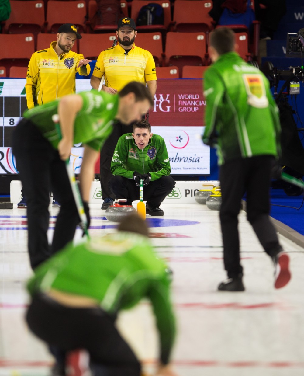 Team Manitoba skip Mike McEwen explains the plan of attack while playing Team Prince Edward Island John Likely at the 2019 Tim Hortons Brier Wednesday afternoon.Team Wild Card 2 led by skip Brendan Bottcher take on Team Northern Ontario led by skip Brad Jacobs in a curling game at the 2019 Tim Hortons Brier at Westoba Place Saturday. (Chelsea Kemp/The Brandon Sun)Chris Jaster/The Brandon Sun