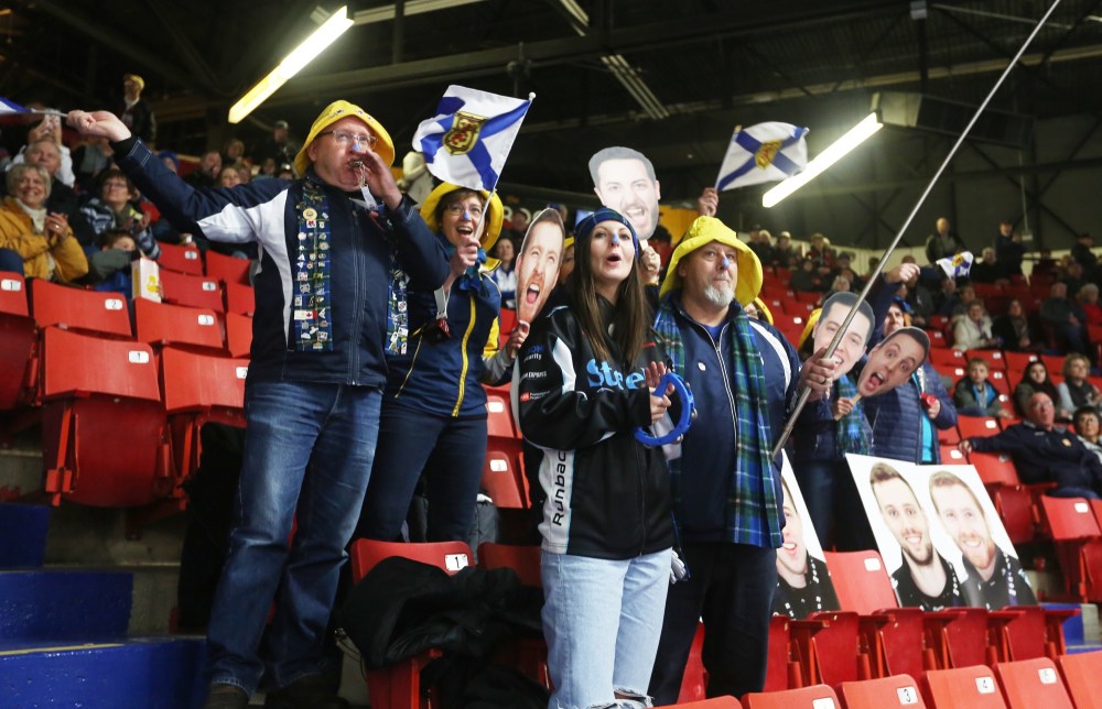 A crowd of fans from Nova Scotia, including player Stuart Thompson's parents Kate and Stephen, cheer on their team on Sunday at the Brier.Chelsea Kemp/The Brandon Sun