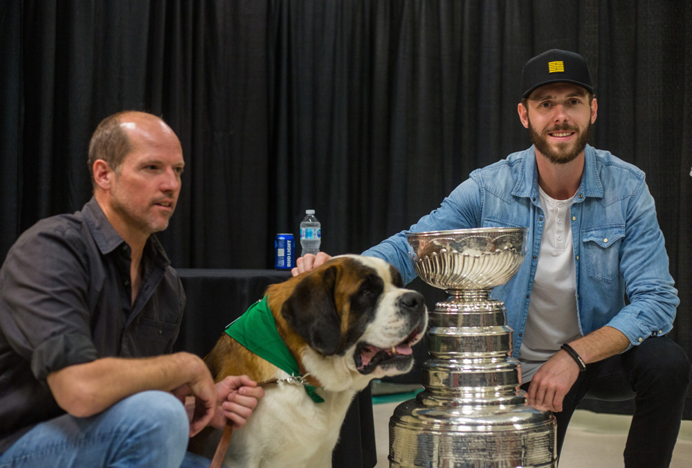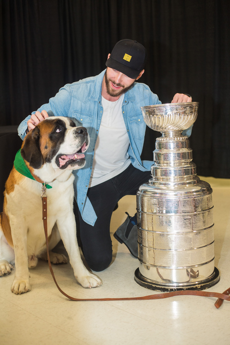 The Blues’ defenceman gave the St. Bernard a good petting before he, Grizzly and Saler posed for a photo. Not stealing the spotlight from his dog, Saler let Edmundson take a photo with just Grizzly and the cup as well.