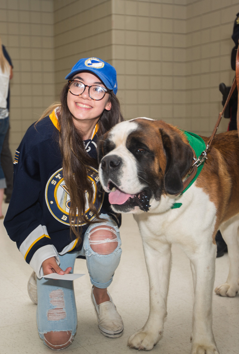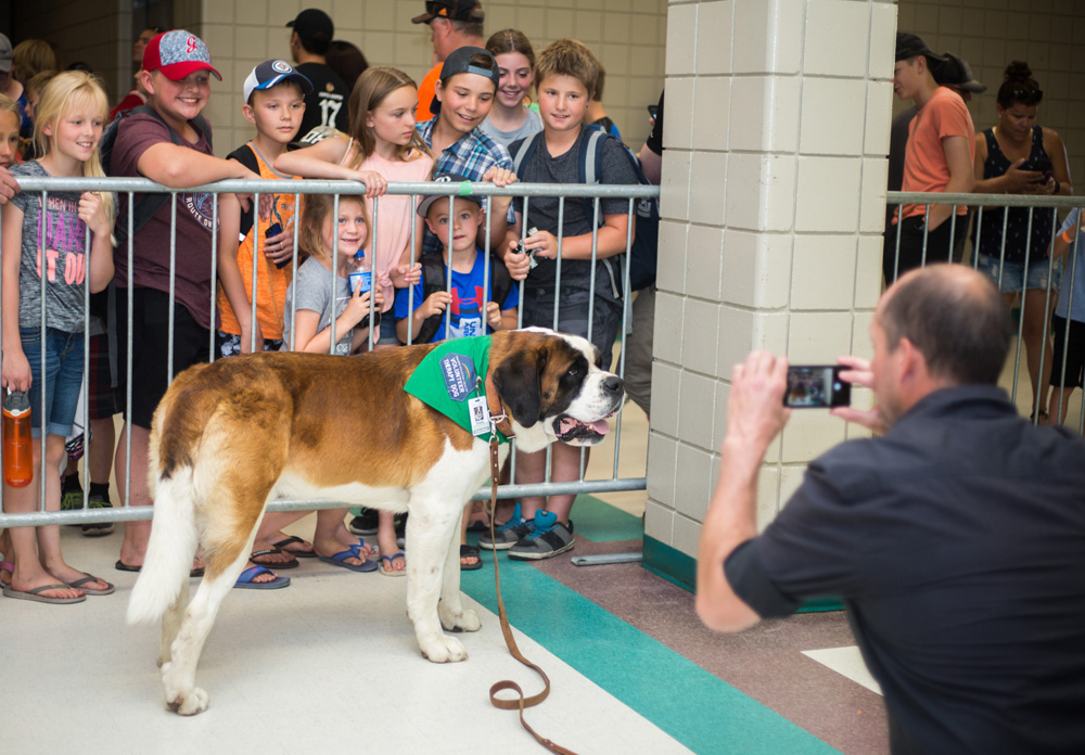 Local therapy dog Grizzly the St. Bernard and owner Mark Saler kicked off the festivities at the Keystone Centre by meeting the hometown champ and Canada’s favourite trophy. At 150 pounds, Grizzly was impossible to avoid, not that anyone tried.