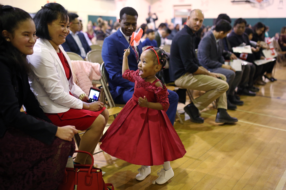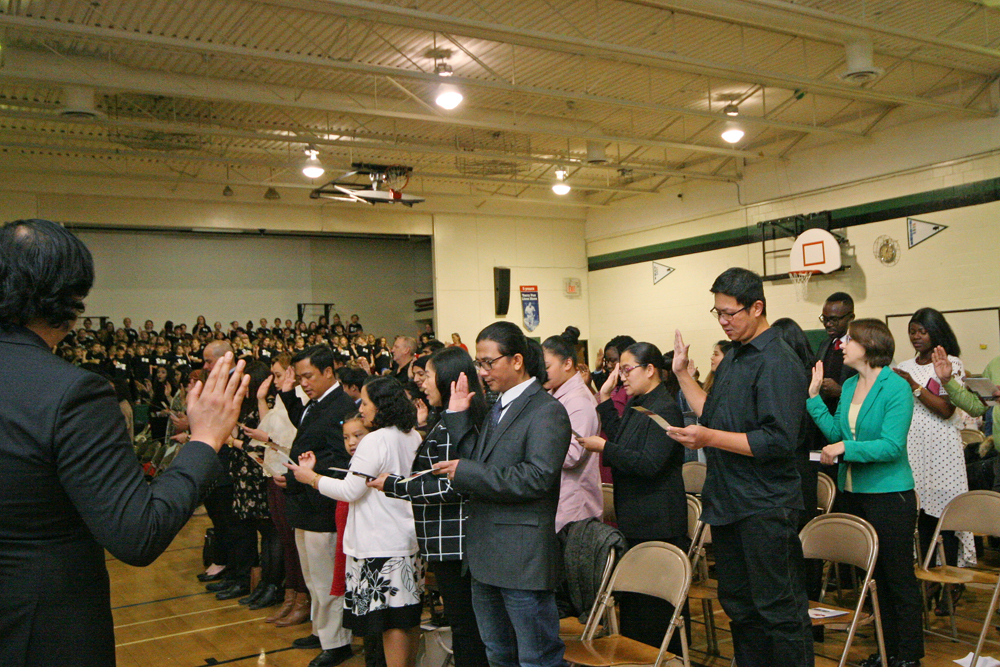 People young and old beamed with pride as they swore an oath and got their citizenship documentation in the school’s gym.