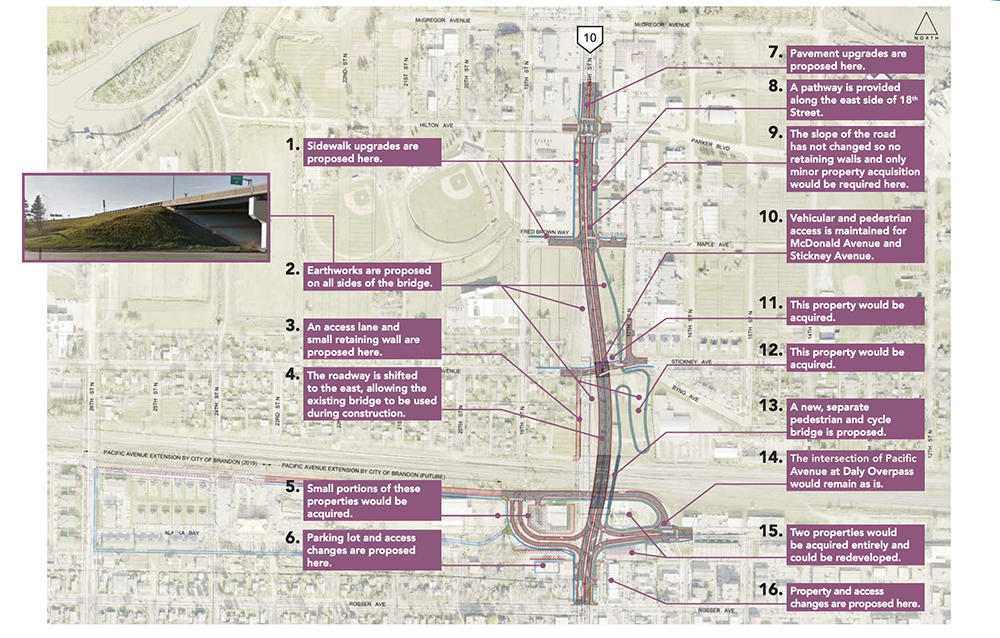 The proposed new bridge itself bends to the east as it crosses over the Canadian Pacific Railway tracks north of Pacific Avenue. According to the design document, this is to ensure the existing bridge can still be used during construction.