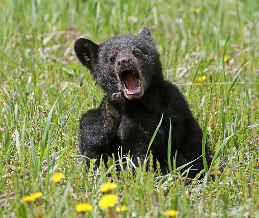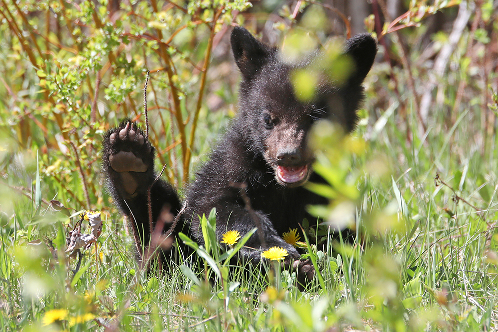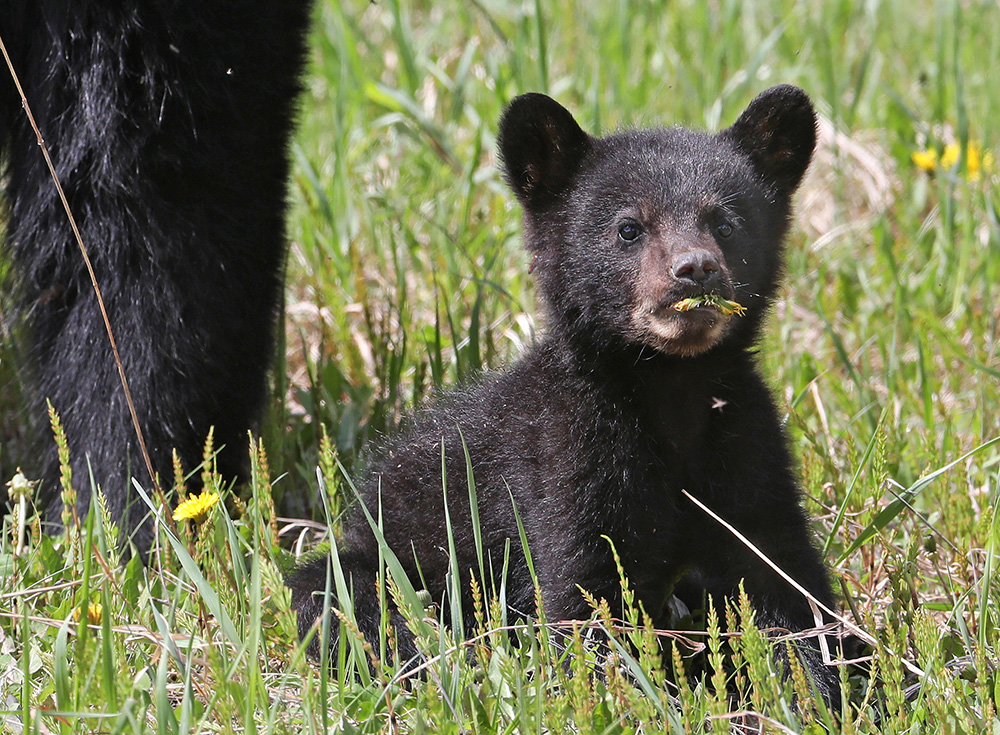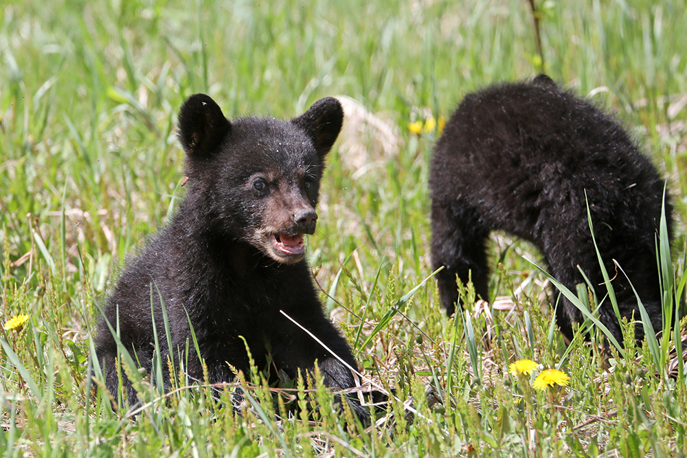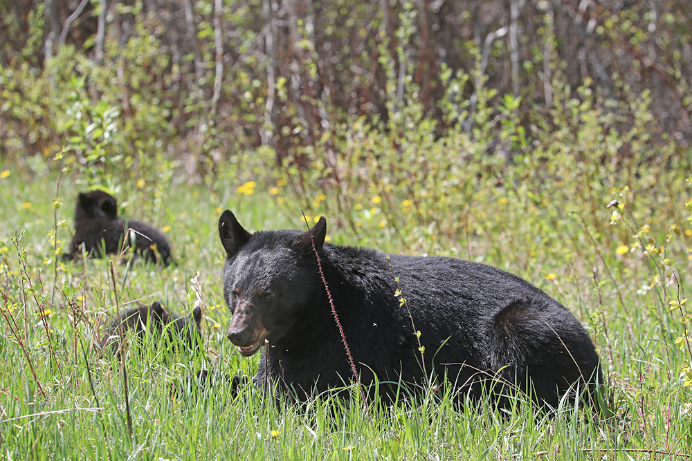 A black bear mother and her two cubs forage in a clearing next to Highway 10 in Riding Mountain National Park on a hot Wednesday afternoon. While mom relaxed, the cubs enjoyed playing in the grass and muncing on dandelions.