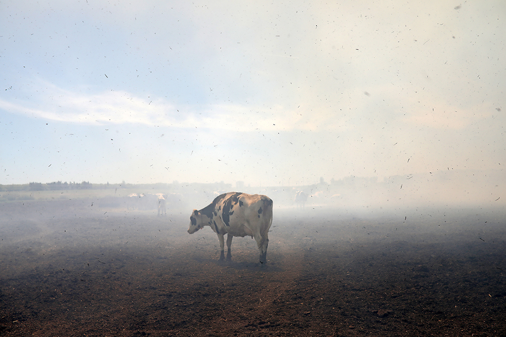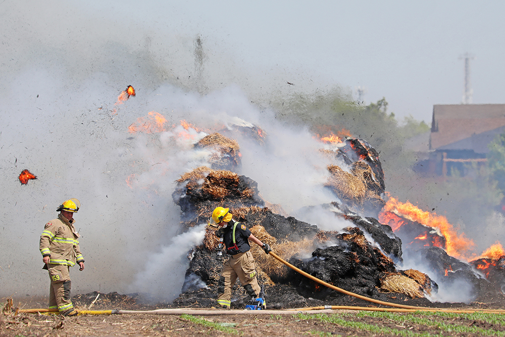 A fire blazed through silage on a farm at the western edge of Brandon on Monday afternoon.