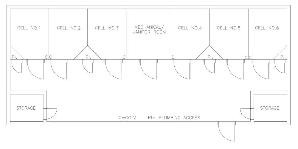 Each cell will have a bench/bed combo, a sink/toilet combo, a floor drain, a camera and tamper-proof light fixtures and grills for heating and cooling. While building codes must be followed as per the tender document, the temporary structure will not require fire-rated doors or fire separations because “the cell block will be continually monitored.”