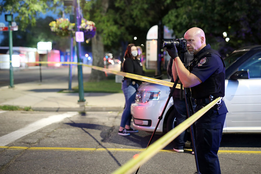 DOWNTOWN ASSAULT Brandon Police Service members work at the scene of a reported stabbing at Ninth Street and Princess Avenue on Thursday evening. Several witness from the Kristopher Campbell Memorial Skate Plaza reported that an adult was assaulted and stabbed by a group of passersby at approximately 8 p.m. The victim was taken to Brandon Regional Health Centre by ambulance. As of deadline, Brandon Police Service was still investigating and had yet to respond to a request for comment. (Tim Smith/The Brandon Sun)