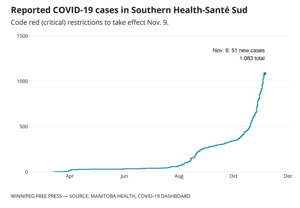 Southern Health communities affected by code red (critical) restrictions to take effect Nov. 9: Altona, Carman, Elie, Gladstone, La Salle, MacGregor, Morden, Morris, Niverville, Pilot Mound, Portage la Prairie, Rosenort, Sprague, Ste. Anne, St. Pierre, Steinbach, Vita, Winkler.