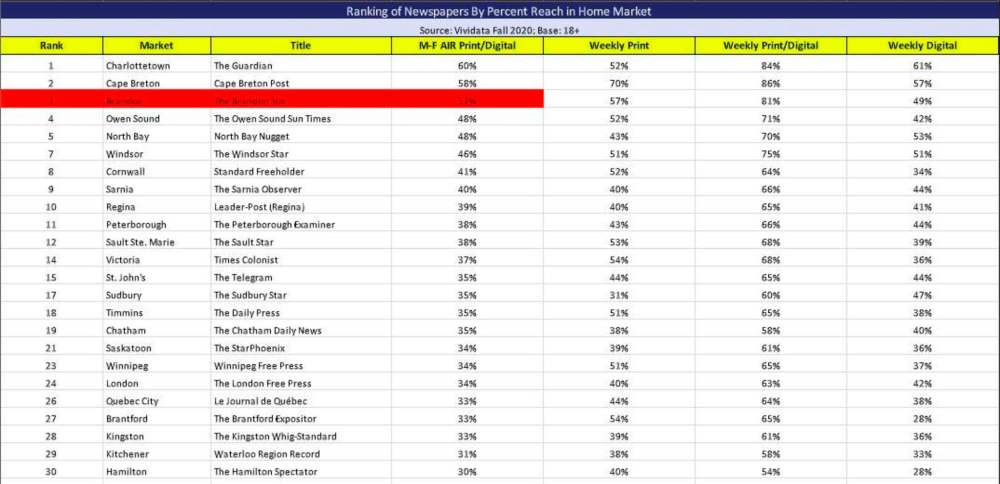 The study, which included 64 newspapers across the country, measures what percentage of a region engages with newspapers’ digital and print editions, breaking down results into four categories. Approximately 32,000 people were polled nationwide for the study, including 222 in Brandon.
