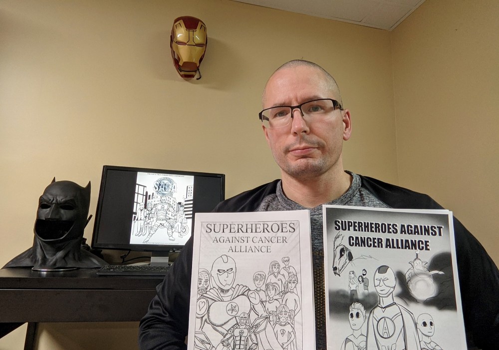 The resulting Superheroes Against Cancer Alliance comic book features superheroes joining their families and medical team in facing off to defeat evil cancer. It’s printed in black and white so kids going through treatment can colour it themselves.