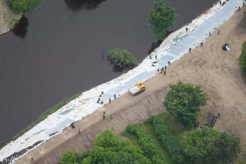 Aqua dams were installed on top of existing dikes to further reinforce them. In the east end, a sandbag dike breached, flooding a business and a home near 17th Street East.