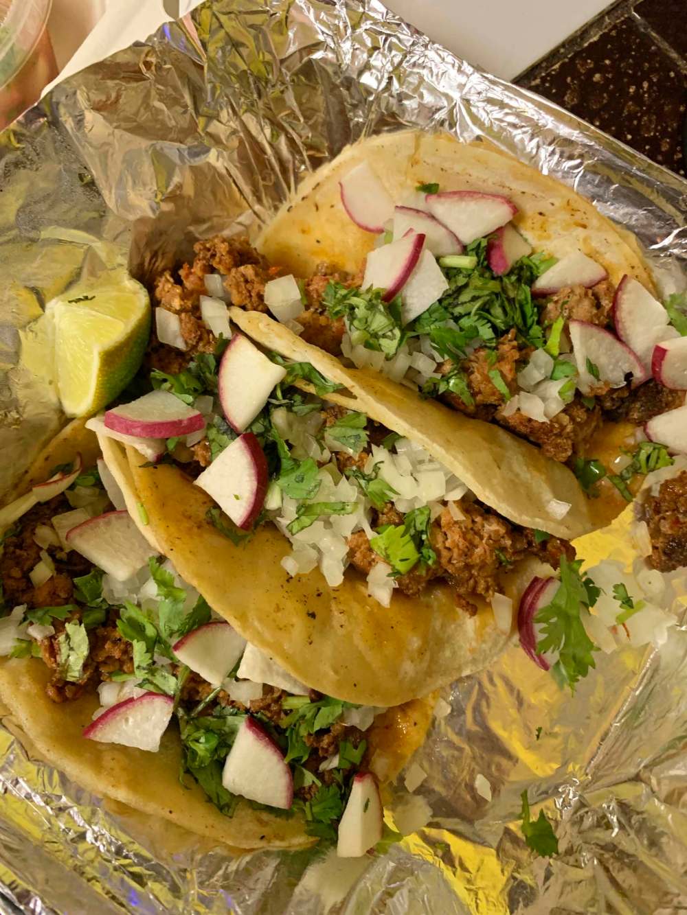 The daily special of three pork chorizo tacos and the fixings from Mariachi Mexican Tacos food truck.