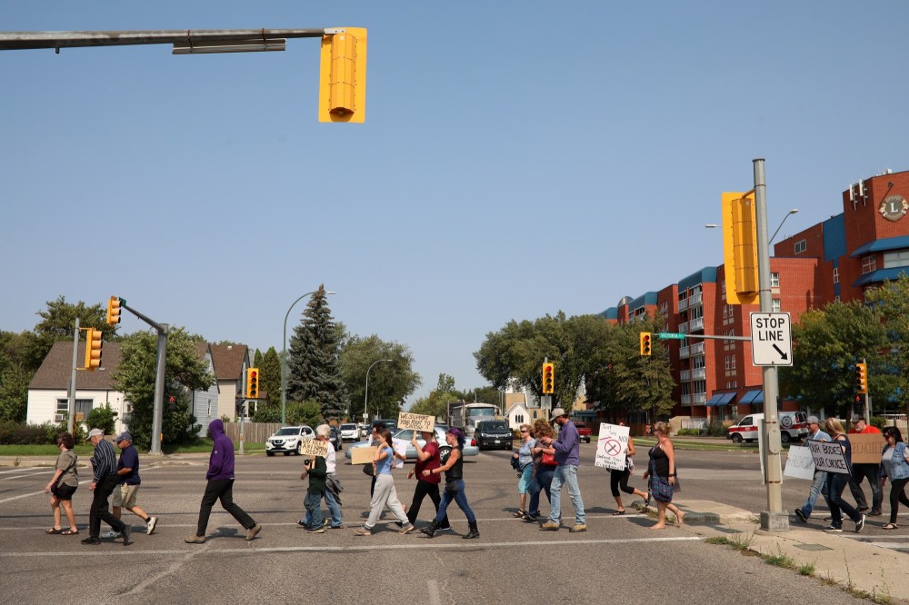 The protesters, some carrying signs reading “We support your right to choose” and “Why stop at vaccine mandates?” and few wearing masks, walked a route outside the Brandon Regional Health Centre and down Victoria Avenue.