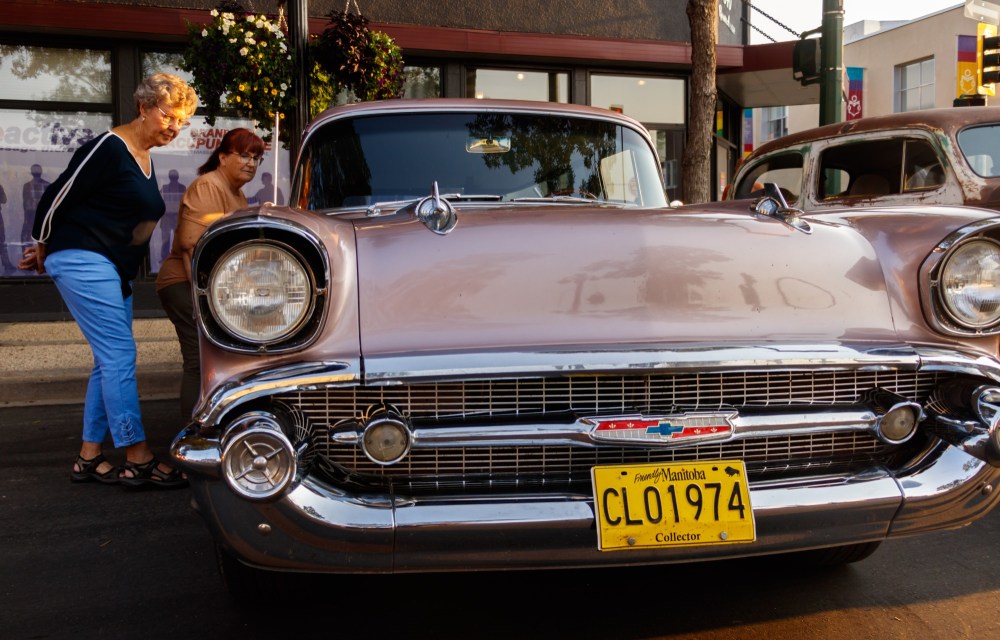Chelsea Kemp/The Brandon Sun Marilyn Winters, left, and Kathy Bruneau check out a ride during Cruise Night in Downtown Brandon on Thursday.