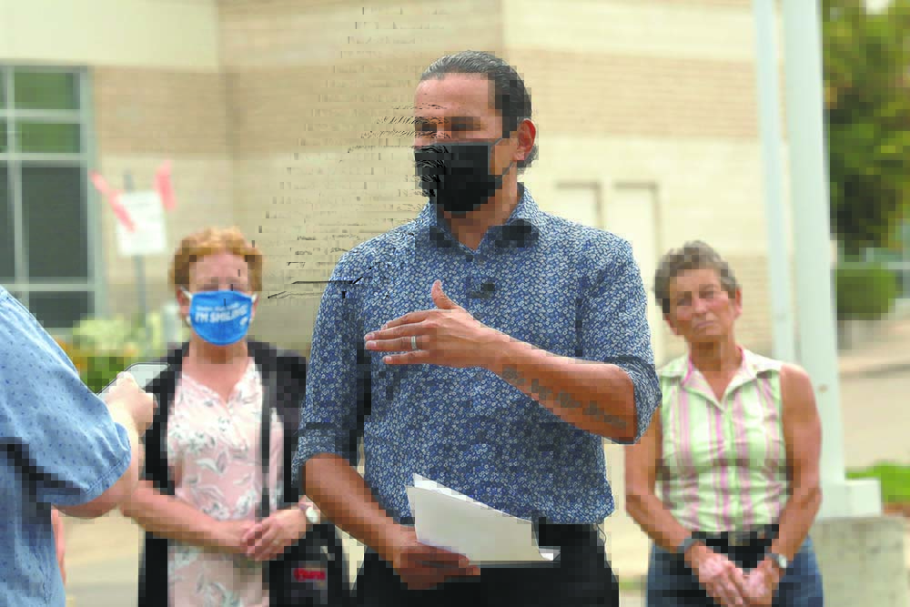 Matt Goerzen/The Brandon Sun With a line of nursing staff from Prairie Mountain Health behind him, NDP Leader Wab Kinew gives a media presentation outside of the Brandon Regional Health Centre in August. Kinew recently condemned PMH's cuts in the last few years.