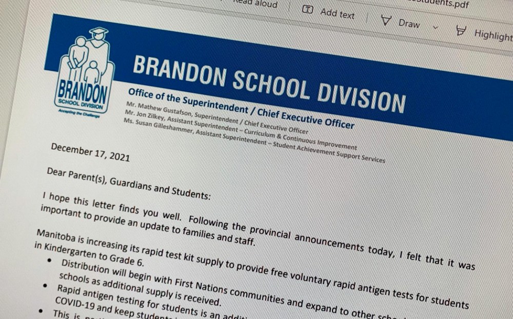 Brandon School Division is not aware of when it will receive a shipment, but it’s not expected until the new year, the letter said. However, the division will send a survey to parents which will allow families to opt out of receiving a test kit.