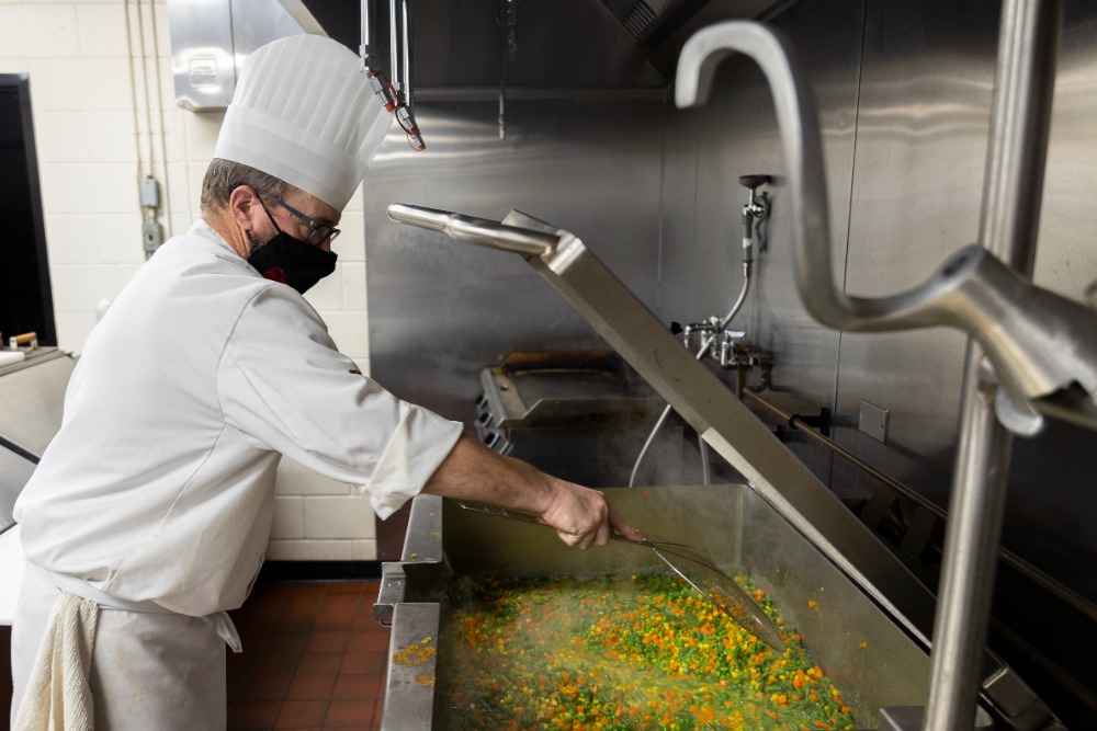 The kitchen of the high school had a volunteer chef on hand, cooking vegetables and heating hams, while meals were packaged in the cafeteria by an assembly line of volunteers.