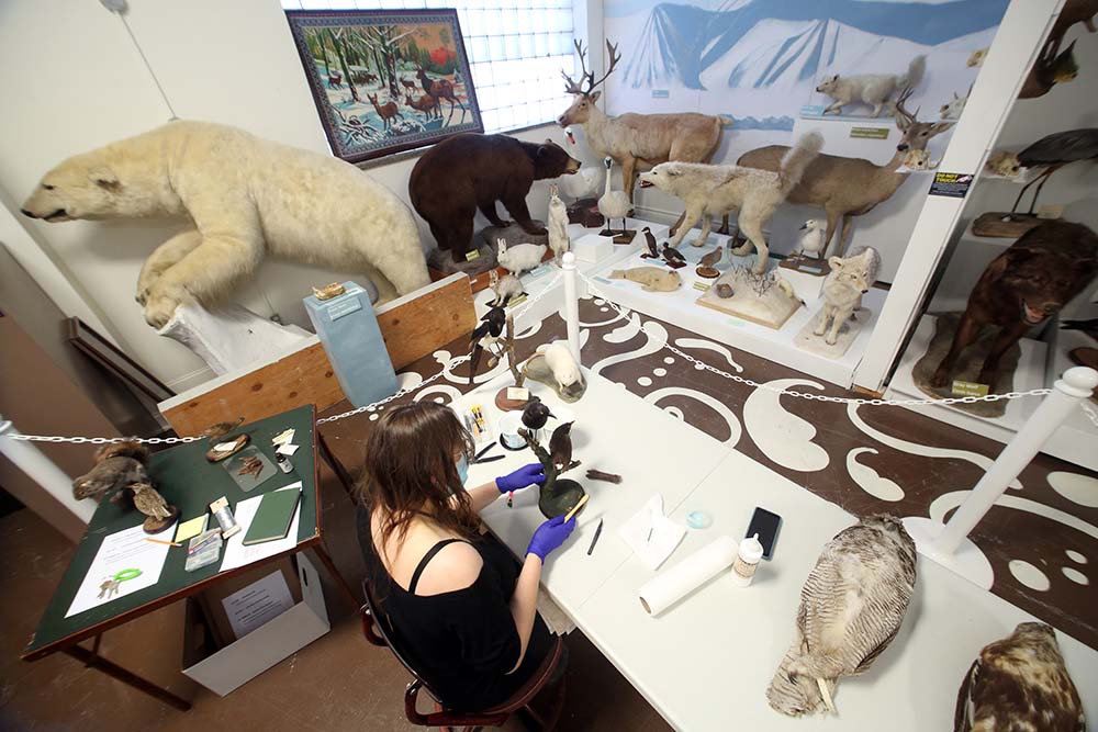 “Dust is the worst thing,” Wowchuk says, while busily dabbing glue to the broken edge of a stuffed grackle’s tail. “Dust can collect on something, it holds in moisture, it attracts other kinds of things, so constant cleaning is necessary.