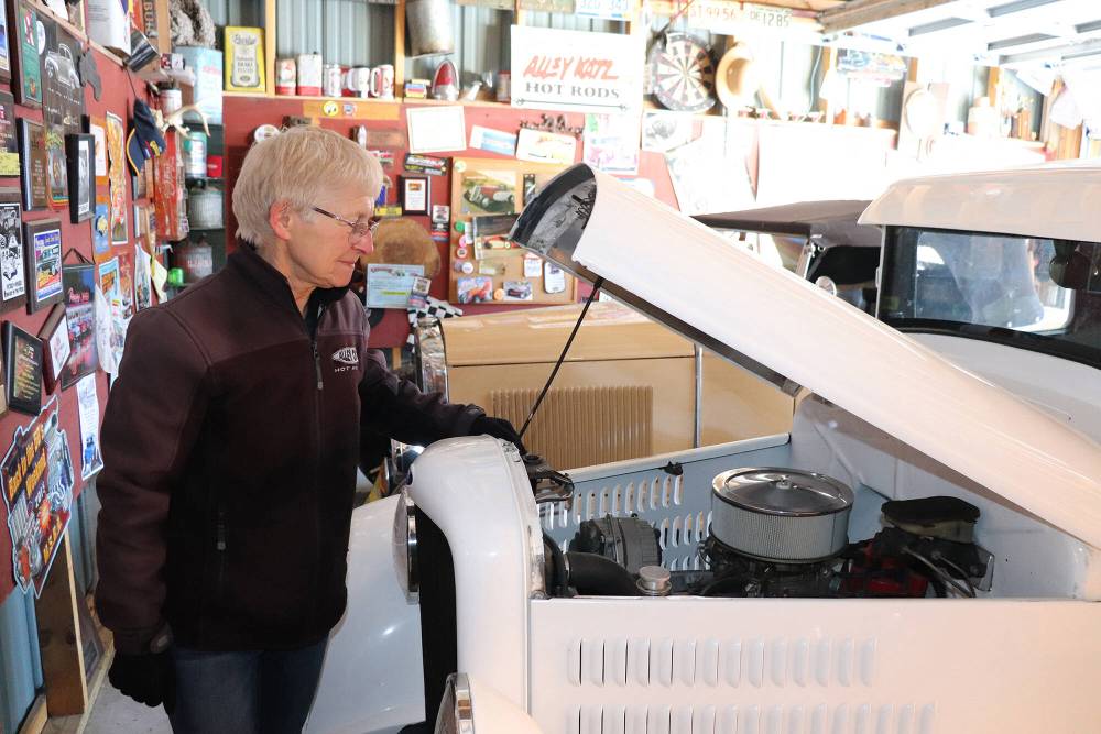 Kyle Darbyson/The Brandon Sun Balanyk checks in on the 350 Chevrolet motor that powers her modified 1934 Ford pickup truck.