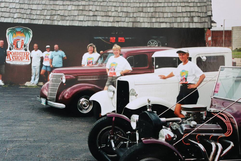 Liz Kitzul, Kathy Milne and Balanyk park their hot rods in Elgin, Ill. sometime in the 2010s. The