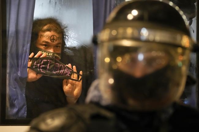 A detained demonstrator shows a sign 'No War!' from a police bus in St. Petersburg, Russia, Thursday, Feb. 24, 2022. Hundreds of people gathered in Moscow and St.Petersburg on Thursday, protesting against Russia's attack on Ukraine. Many of the demonstrators were detained. Similar protests took place in other Russian cities, and activists were also arrested. (AP Photo/Dmitri Lovetsky)