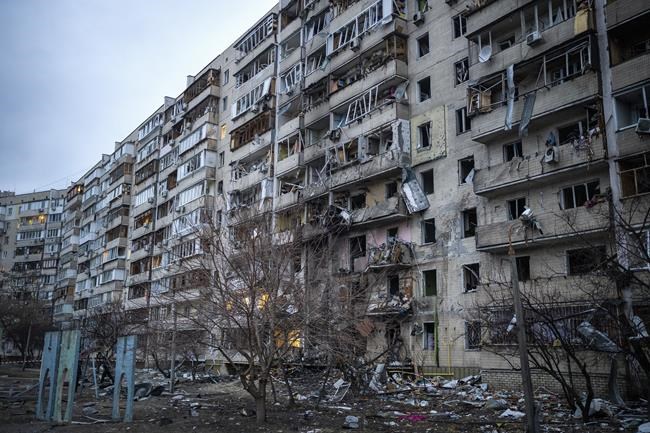 View of a building damaged following a rocket attack the city of Kyiv, Ukraine, Friday, Feb. 25, 2022. (AP Photo/Emilio Morenatti)