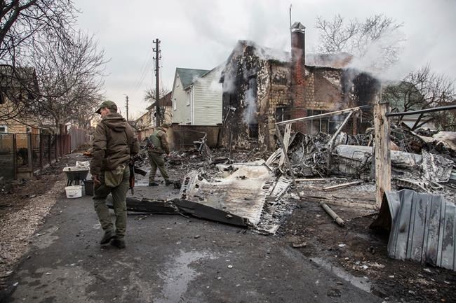 Ukrainian servicemen walk at fragments of a downed aircraft seen in in Kyiv, Ukraine, Friday, Feb. 25, 2022. It was unclear what aicraft crashed and what brought it down amid the Russian invasion in Ukraine Russia is pressing its invasion of Ukraine to the outskirts of the capital after unleashing airstrikes on cities and military bases and sending in troops and tanks from three sides. (AP Photo/Oleksandr Ratushniak)