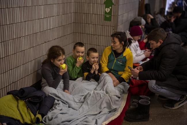 A family sit in the Kyiv subway, using it as a bomb shelter in Kyiv, Ukraine, Friday, Feb. 25, 2022. In Ukraine's capital, many residents hurried underground for safety overnight Thursday and Friday as Russian forces fired on the city and moved closer. (AP Photo/Emilio Morenatti)