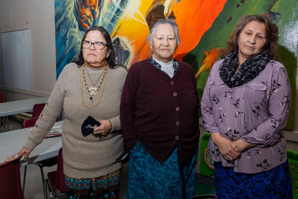 Chelsea Kemp/The Brandon Sun Healing the Family Within session participants Julia Brandon (left), Alice Rose Clearsky and Linda Clearsky at the Mahkaday Ginew Memorial Centre Friday.
