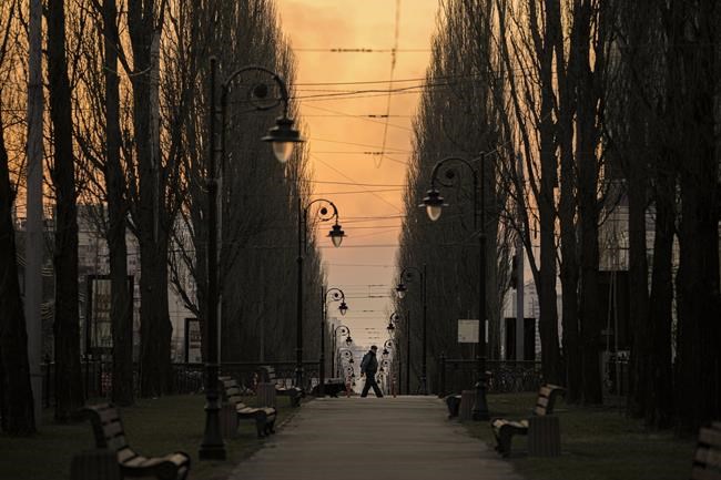 A man walks at dusk in Kyiv, Ukraine, Saturday, March 19, 2022. Russian forces pushed deeper into Ukraine's besieged and battered port city of Mariupol on Saturday, where heavy fighting shut down a major steel plant and local authorities pleaded for more Western help. (AP Photo/Vadim Ghirda)