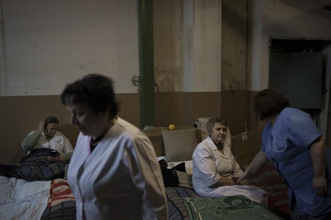 Medical staff rest in a basement used as a bomb shelter at the Ohmatdyt children's hospital in Kyiv, Ukraine, Saturday, March 19, 2022. (AP Photo/Felipe Dana)