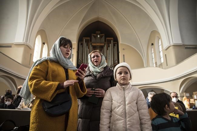 Members of the Ukrainian Orthodox community, who have found shelter for their church service in an evangelical church, sing during a church service and prayer for peace in Berlin, Sunday, March 20, 2022. (AP Photo/Steffi Loos)