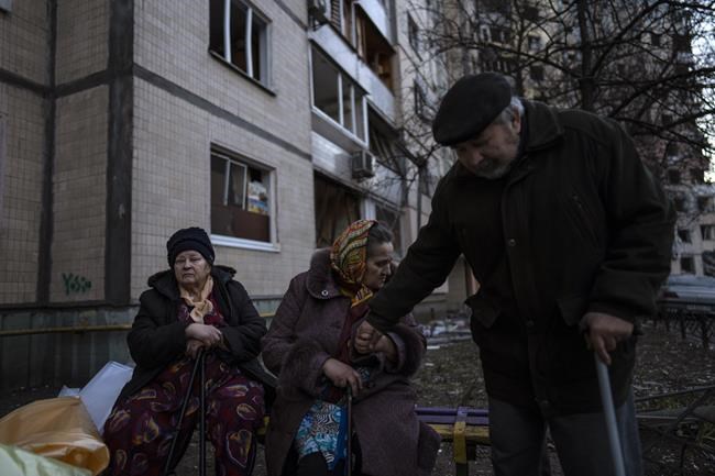 People gather outside their destroyed buildings after a bombing in Satoya neighborhood in Kyiv, Ukraine, Sunday, March 20, 2022. (AP Photo/Rodrigo Abd)