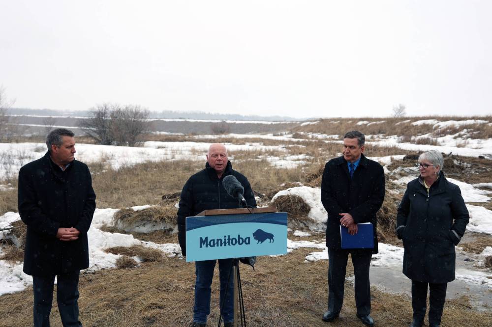 Riverdale Municipality Coun. Ian Dyer (second from left) talks about reconstruction work planned for the Rivers dam on Tuesday afternoon, flanked by deputy premier Cliff Cullen (left), Transportation and Infrastructure Minister Doyle Piwniuk (second from right) and Municipal Relations Minister Eileen Clarke. (Colin Slark / The Brandon Sun)
