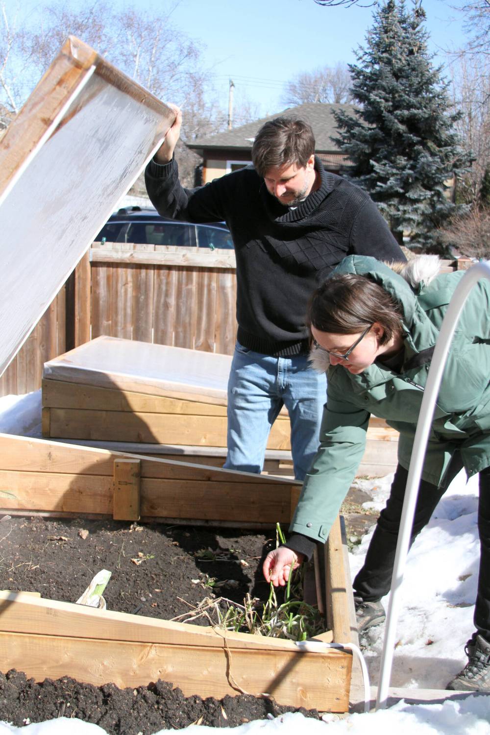 To protect their raised beds, Lazerte and Koiter cover them in cold frames — a type of greenhouse cover to trap heat and keep out the elements — mulch and tarps. A quick inspection of their cold frames in late March showed promise, with some green onions and herbs poking out of last fall’s dead leaves and mulch groundcover.