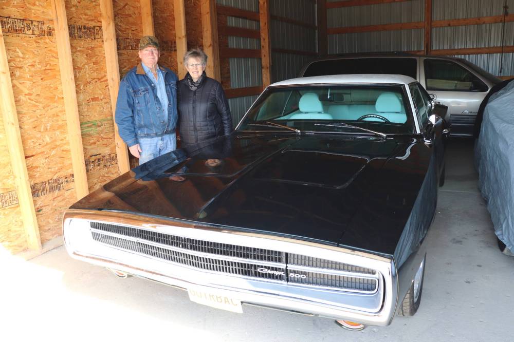 Gary and Ann Magwood pose for a photo next to their 1970 Dodge Charger Wednesday morning in Killarney. Even though this classic muscle car has been in storage for a while, the couple is hoping to get it back on the road sometime this spring or summer.