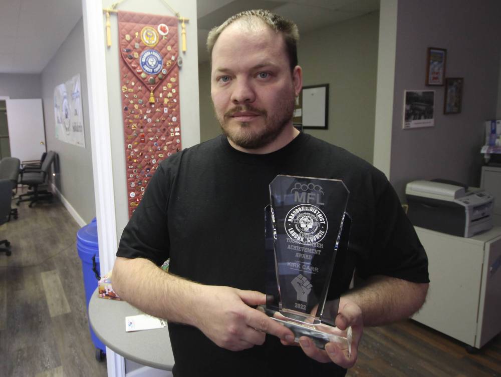 Kirk Carr, president of the Brandon and District Labour Council, received the Young Member Achievement award from the Manitoba Federation of Labour Friday morning. The award came at the organization’s 2022 convention.
