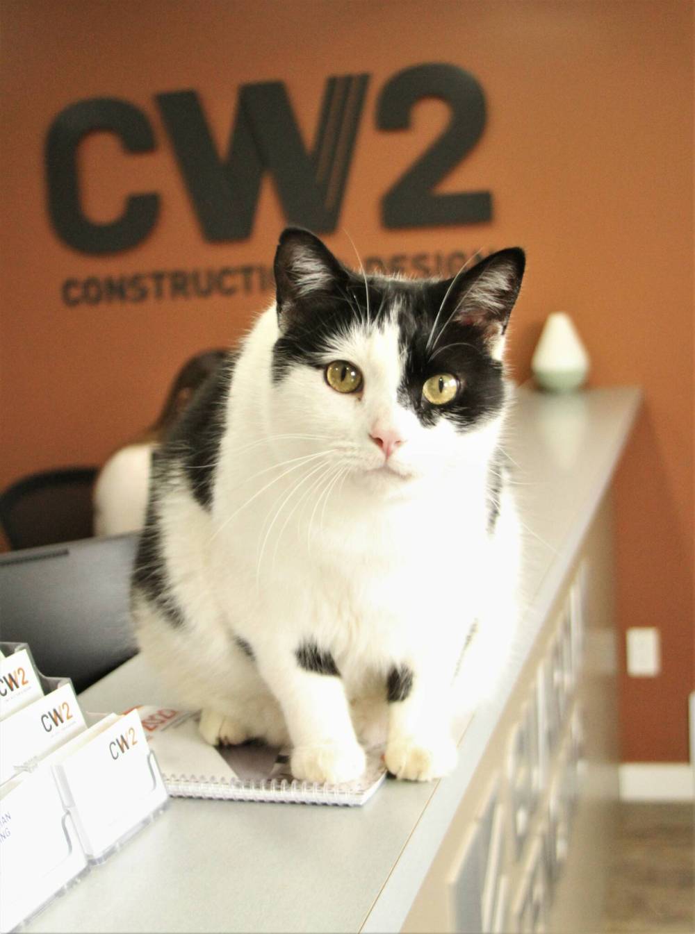 Phinn, the office cat for CW2 Construction and Design, can be found greeting customers at the front desk and being spoiled by staff.