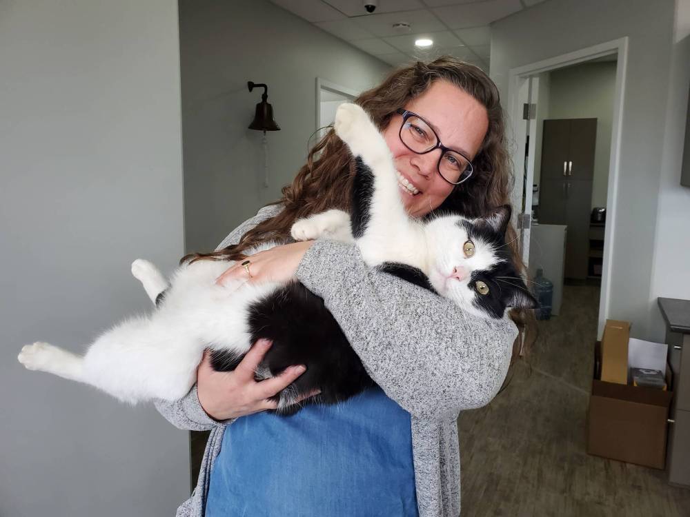Becky Farguson, administrative assistant at CW2 Construction and Design, shares a snuggle with Phinn, the firm’s live-in cat and “morale officer.”