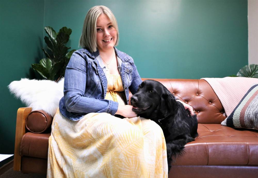 Ashley Collier, owner of Wildflower Counselling, sits on the couch at her office with Juniper, her family pet and soon-to-be trained therapy dog.