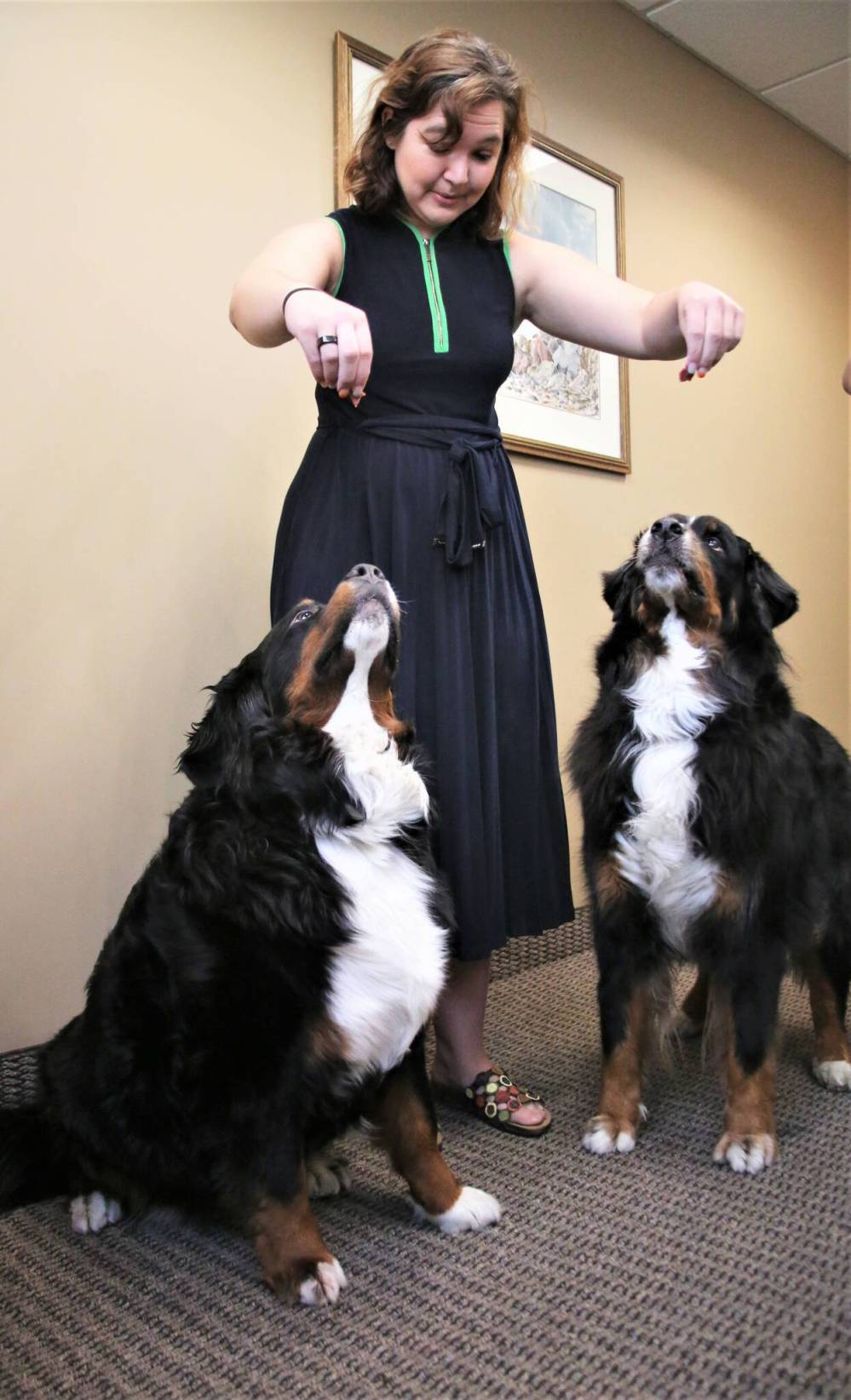 Rhea Majewski offers a few treats to her Bernese mountain dogs Fern (left) and Maude. The dogs are regular visitors to Majewski’s workplace, Donald and Kehler Law Office.