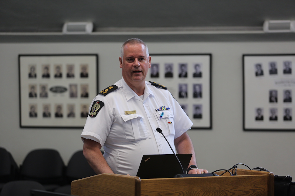 Drew May/The Brandon Sun Brandon police Chief Wayne Balcaen gave information about photo-radar technology to the Brandon Police Board Friday.