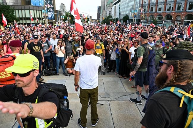 At one point the crowd was treated to a speech by a man wearing a military beret and civilian clothes who denounced defence chief Gen. Wayne Eyre’s order that all Canadian Armed Forces members be fully vaccinated. Members of the crowd booed loudly.